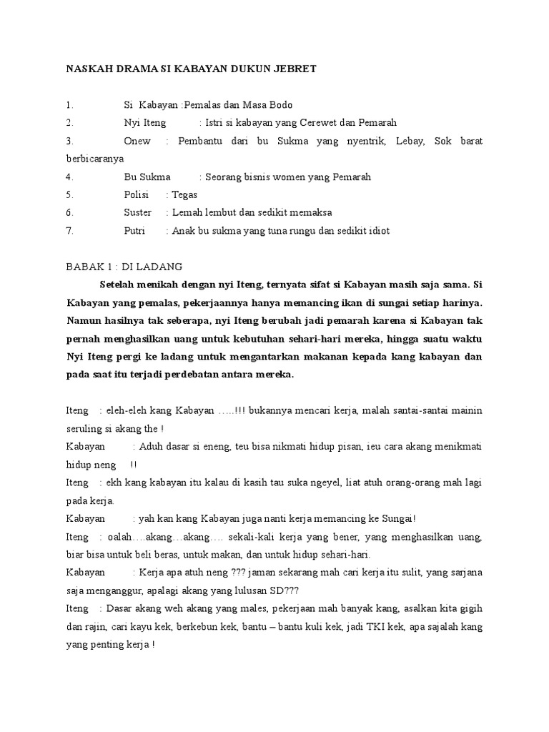 Naskah Drama Si Kabayan Bahasa Sunda - Berbagai Naskah from cdn.vdocuments.site Film pendek kabayan jadi dukun. Tata bahasa dan pengucapan dalam bahasa sunda blog kamus. Jadi dukun sotenan kapaksa si kabayan mah. Si kabayan jadi dukun jebret. Si kabayan by utuy sontani, by utuy tatang sontani; Si kabayan :pemalas dan masa bodo nyi iteng : (bari ngudar sarung tina cangkngna, pk dikurudungkeun ka kabayan). Kabayan bikin ulah (2002, komik kompilasi).